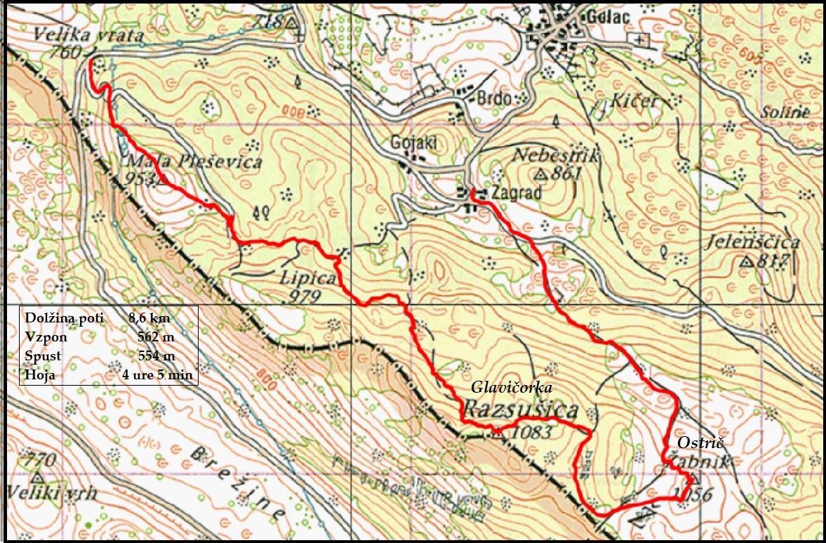 V Zagradu smo stopili med kamnite istrske hiše na kamnito pot med pašniki in postopno prešli v svet borovcev in listnatega gozda, ki je dišal po Pino Silvestre in mokrem listju, travah in gobah, ki na žalost niso bile prave. Drevje, grmičevje in brinje se je redčilo, steza med kamenjem in travo pa je v ključih, sopihajoče krenila na 1056 m visoki vrh Ostrič ali Žabnik, kjer si je na toplem soncu vsak našel skalo ali samotni bor za občudovanje meglenih, skoraj belih dolin z naselji in hribovji vse do Snežnika in Učke na obzorju.