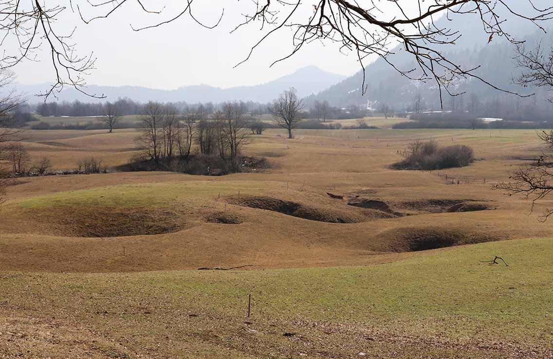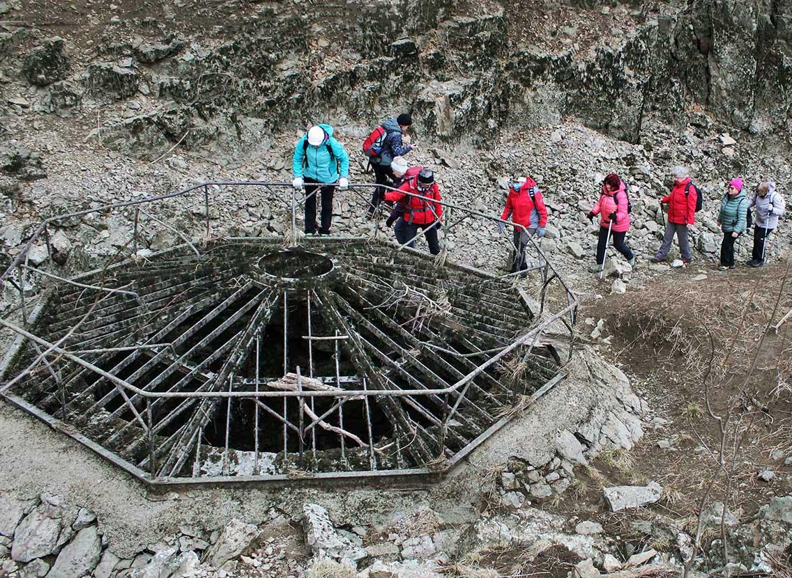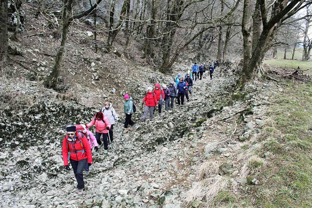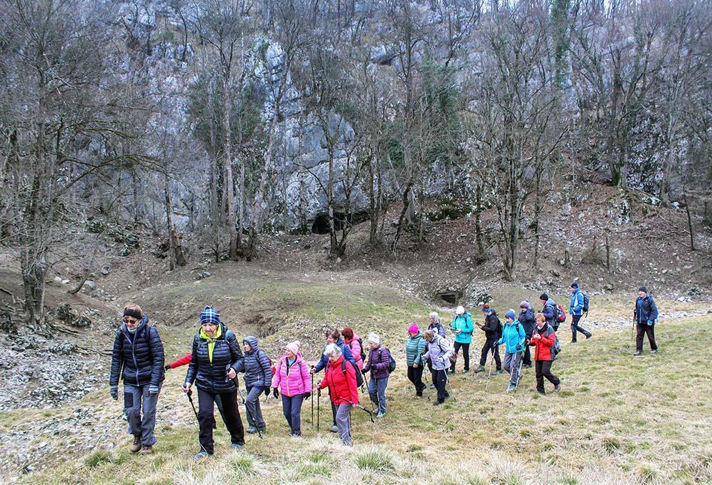 Avtobus smo zapustili v Grčarevcu in se po makadamski poti spustili na nivo polja. Spotoma smo pod robom skozi grmovje opazili ponore V rupah, kjer Unica dela oster ovinek in v stiku z apnencem izgublja vodo. Še lepši prizor se nam je ponudil pri Graberjevih rupah, kjer je voda izginjala v več skalnatih lukenj na koncu kratkih, vijugastih strug. Preko travnikov smo se usmerili proti ponorom Pod stenami, kjer se konča struga Unice. Področje je bilo suho, zato smo si lahko ogledali Putrihove štirne in še druge zamrežene ali proste skalne odprtine, kamor ponika voda Unice ob visokem vodostaju.