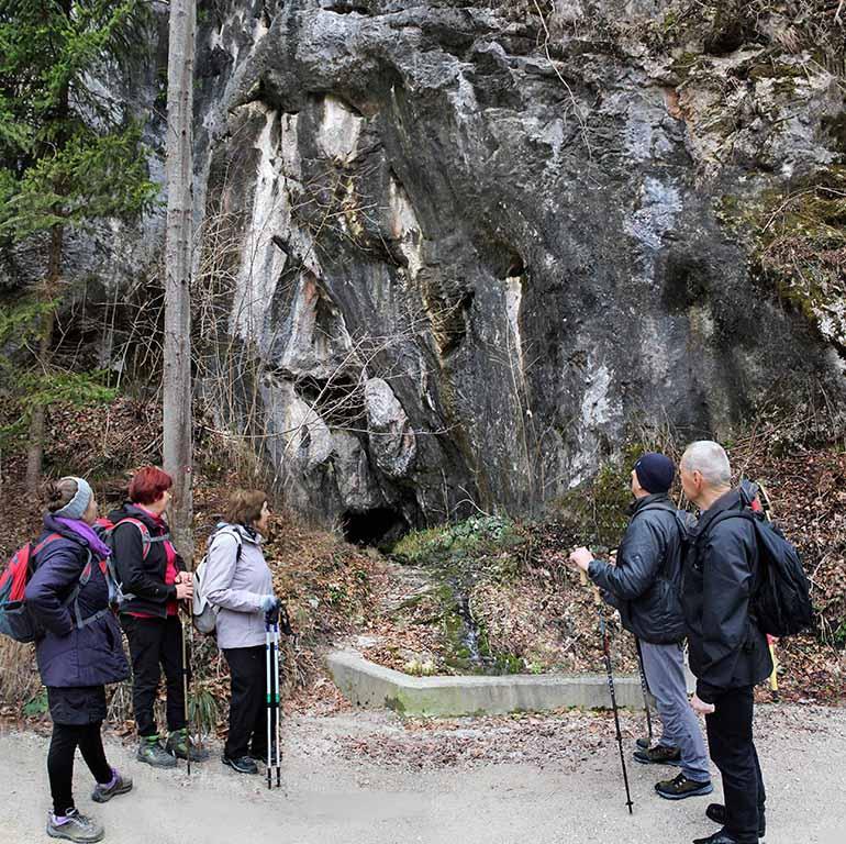 Kmalu po začetku poti smo prišli do kraškega izvira, kjer je voda pritekala iz manjše kraške jame. Vodnica Sonja je poudarila, da je nad izvirom planota Ravnik, ki je za razliko od ostalih Polhograjskih Dolomitov zgrajena iz apnenca, zato se ponaša z nekaterimi značilnimi kraškimi pojavi. Tako smo v nadaljevanju poti po planoti lahko opazili številne vrtače.