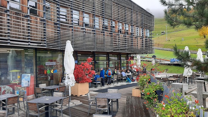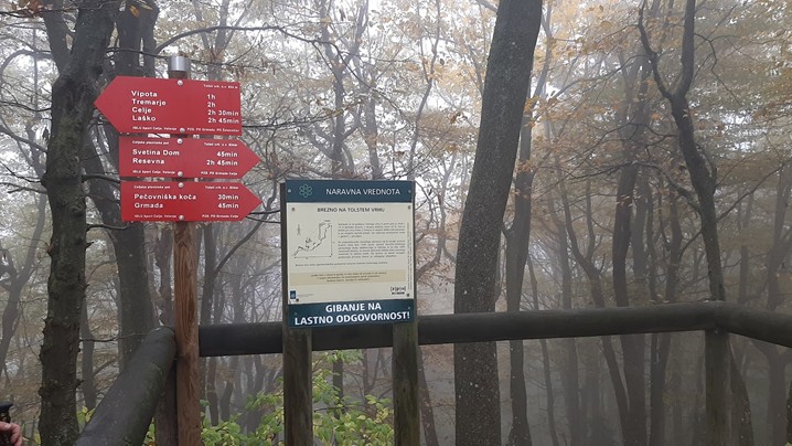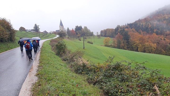Še malo vzpona in že smo dosegli Celjsko kočo, ki ni koča, kot bi si jo predstavljali, ampak večji hotel na robu smučišča, kjer pozimi lahko še vedno uživa veliko ljubiteljev smučanja. Malica iz nahrbtnika in kavica ali pijača iz koče in že smo nadaljevali našo pot. Jože nam je določil naš cilj v kraju Svetina, do tja smo pa morali prehoditi še kar nekaj poti. Podali smo se po gozdni učni poti na 834 m visok Tolsti vrh. Na vrhu je označeno in zavarovano 10 m globoko brezno kot zavarovana naravna vrednota. Od tod se je naša pot samo še spuščala. Ves čas smo se ozirali v nebo, kajti ne samo nizka oblačnost, nakazovale so se nam tudi padavine. Še preden smo zagledali naš cilj, vas Svetino, že smo bili primorani odpreti dežnike ali se ogrniti v pelerine.