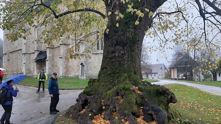 V naselju Svetina nas je najprej pozdravila stara cerkev Marije Snežne iz 15. stoletja. V njeni okolici je tudi kar nekaj mogočnih lip, ki tudi pričajo, da je bilo tod prebivalstvo naseljeno že v davnih časih. V bližini je pokopališče, kjer je grob Alme Karlin in spodobilo se je, da smo ga ob zaključku naše poti, po tako imenovani Almini poti, tudi obiskali.