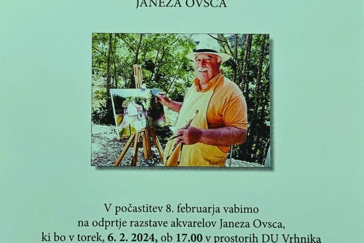 RAZSTAVA AKVARELOV JANEZA OVSCA Pred kulturnim praznikom je bila 6.februarja otvoritev razstave akvarelov Janeza Ovsca v prostorih DU Vrhnika. »Janez Ovsec najpogosteje ustvarja v akvarelu, tudi v akril tehniki in ustvarjanje krokijev. V vsebinskem smislu ima osrednje mesto...
